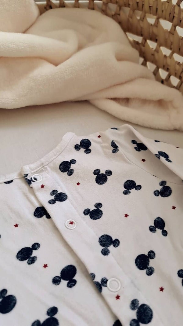 Dünnes Langarm-Shirt mit Muster. Es kann von hinten komplett aufgemacht werden mit einfachen Knöpfen, damit du deine Kleine Maus unkompliziert aus- und anziehen kannst. Es ist in der Grösse 54.