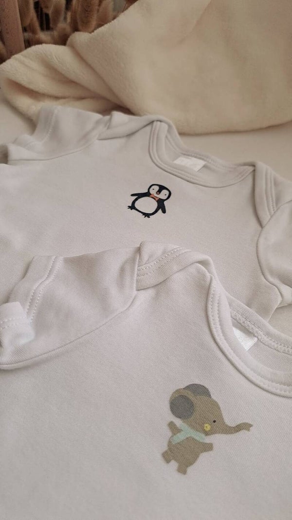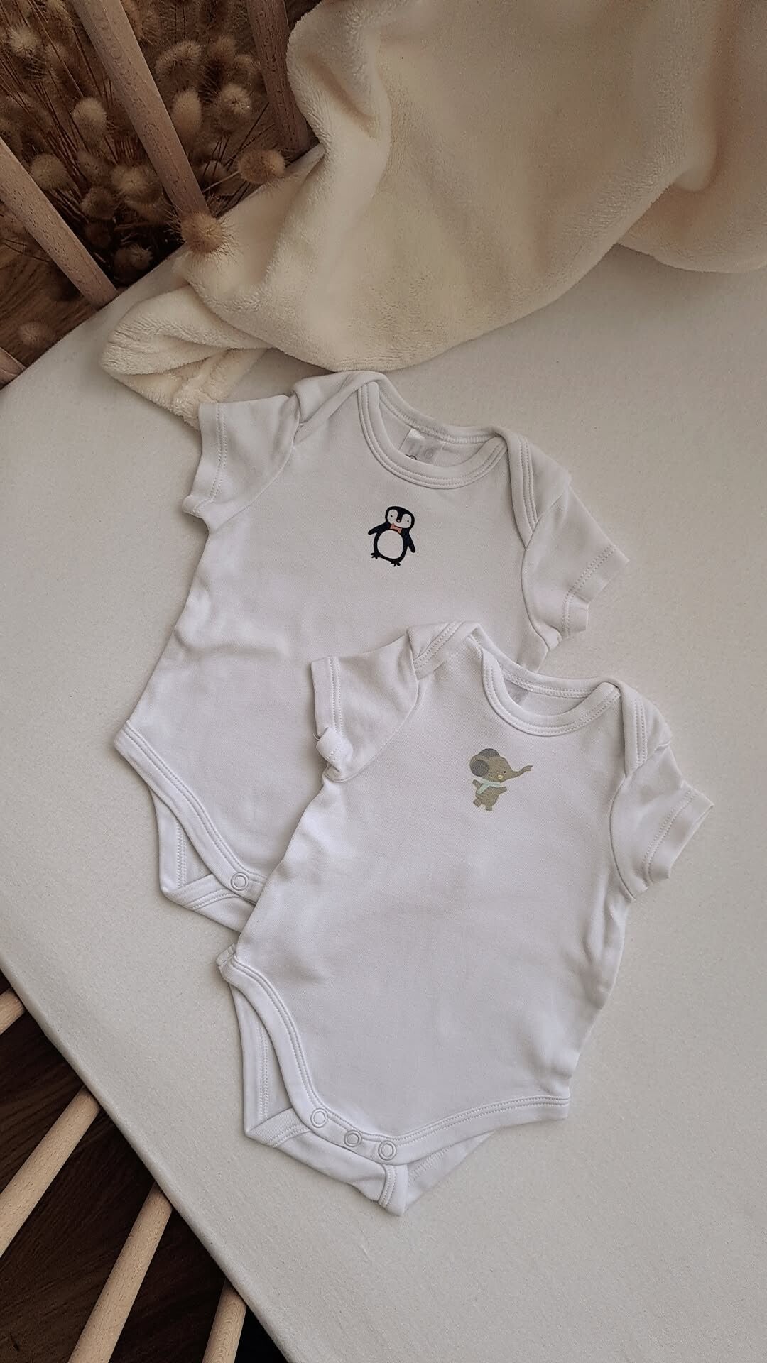 Zwei weisse Bodys mit Tierchen im Set in der Grösse 56