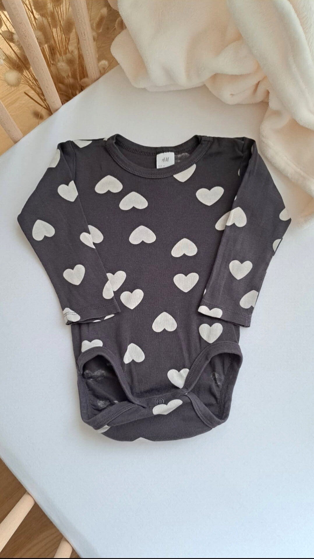 Schwarzes langarm Body mit weissen Härzchen von H&M in der Grösse 74.